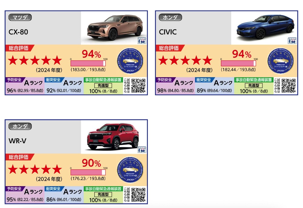 Honda 在此次的测评中也有 2 款车获得五星评级,分别是 Honda Civic 和 Honda WR-V。Honda Civic 的评分紧追在 Toyota 和 Mazda 之后,以 182.44 分拿下 94% 的佳绩,WR-V 则获得 90%(176.23 分)。