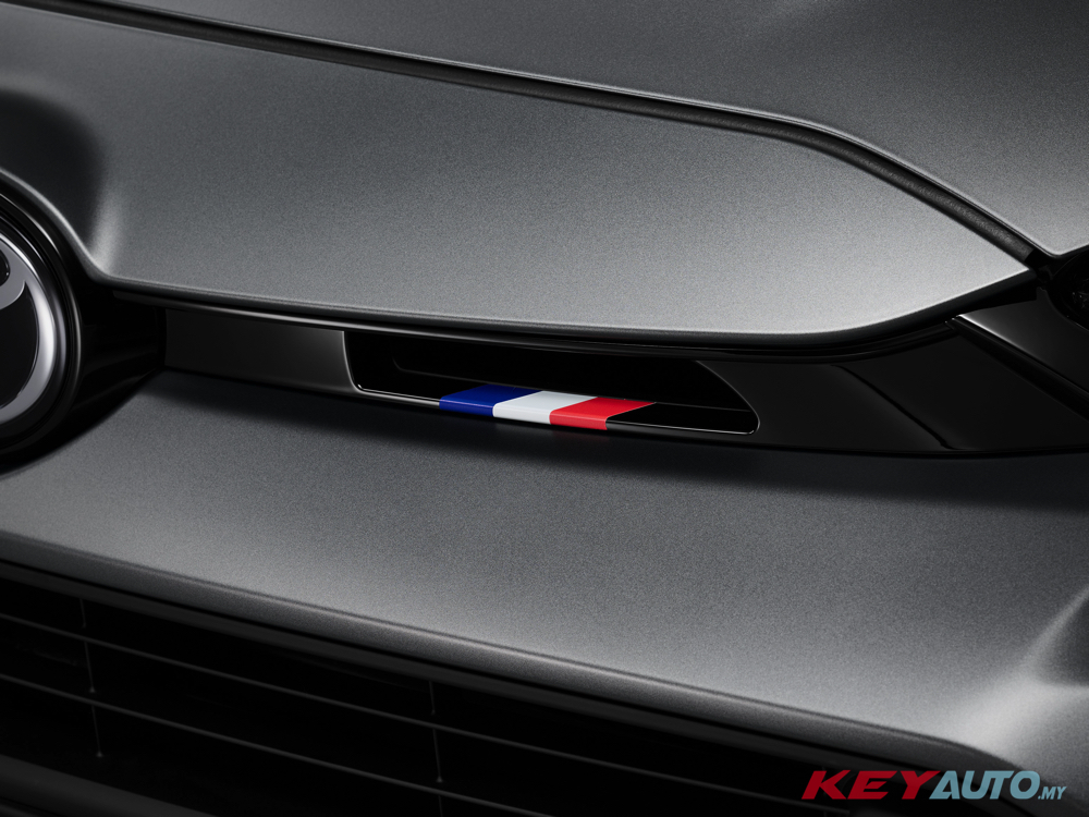 GR Yaris Ogier Edition 采用消光黑涂装、蓝色刹车卡钳、法国国旗的三种颜色作为点缀、固定式碳纤维尾翼。