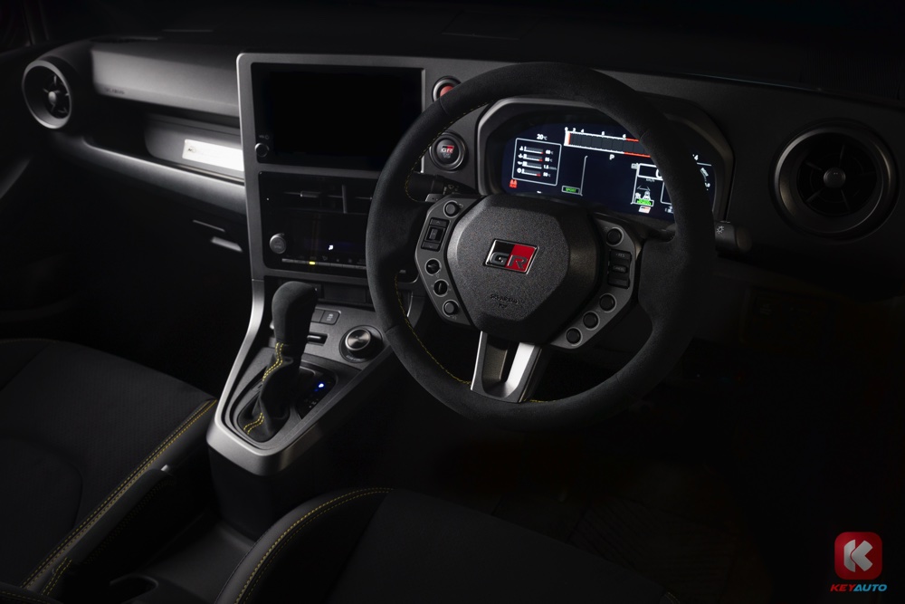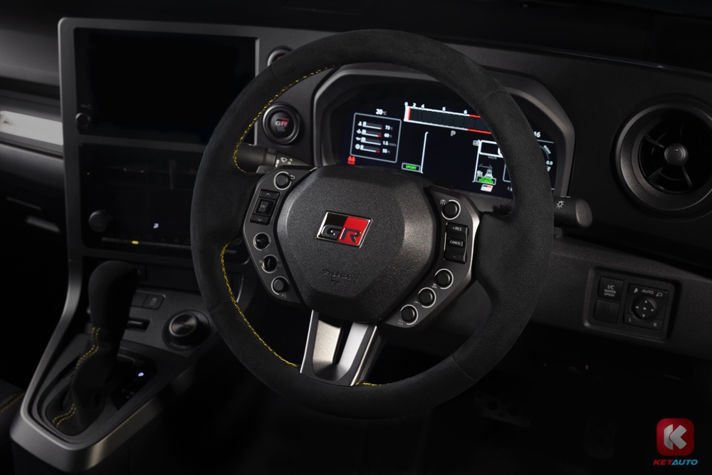 车内的方向盘采用麂皮绒面材质,并且缩小了方向盘的外径,也优化了换挡拨片。据悉,方向盘上的按键也经过改良,是根据 GR Yaris Rally2 拉力赛的经验而设计,每个按钮都采用独立布局。