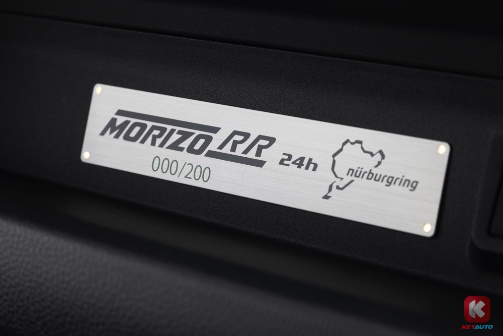 车子配有碳纤维引擎盖、碳纤维尾翼、前扰流板、侧裙、Morizo RR 标志、扰流板,以及专属座椅和 Morizo RR 序号铭牌。轮圈的部分采用雾面青铜色配上黄色刹车卡钳。