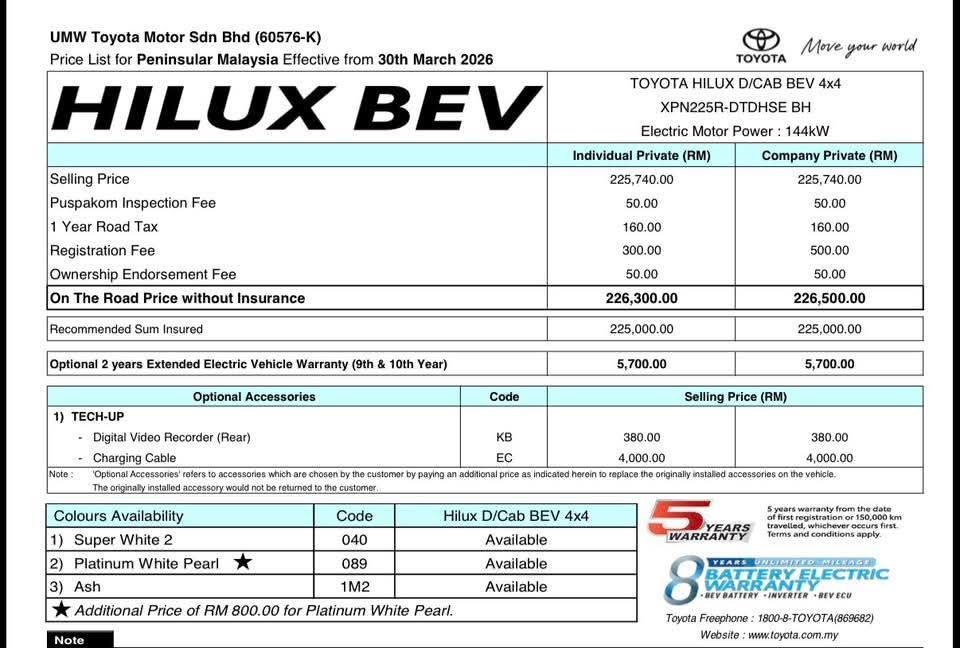 Toyota Hilux BEV 大马价格曝光:RM226,300 起,最高续航 240km!