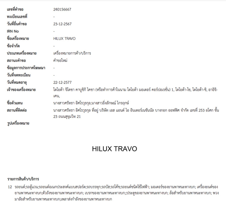 泰国 Toyota 正式向泰国知识产权局(DIP)提交 “Hilux Travo” 申请,引起当地媒体热议,推测 “Hilux Travo” 将成为下一代Hilux 的名称。