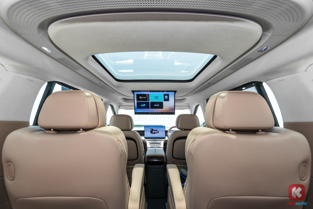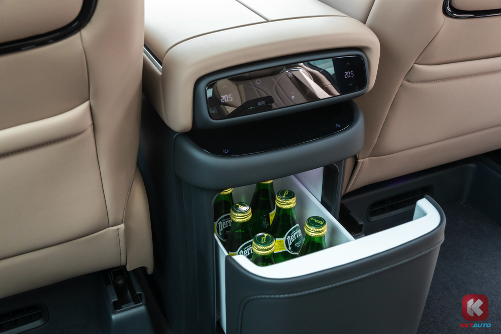 内装整体格局保持原样,配备升级相对较大,获得新的电吸门、220V 电源接口、V2L 升级至 6kW、全车四个 ISOFIX 儿童安全座椅接口、氛围灯 AI 智能混色、21.4 寸后座娱乐屏幕新增蓝光护眼功能、小型冰箱外壳从塑料材质改为软质材料。