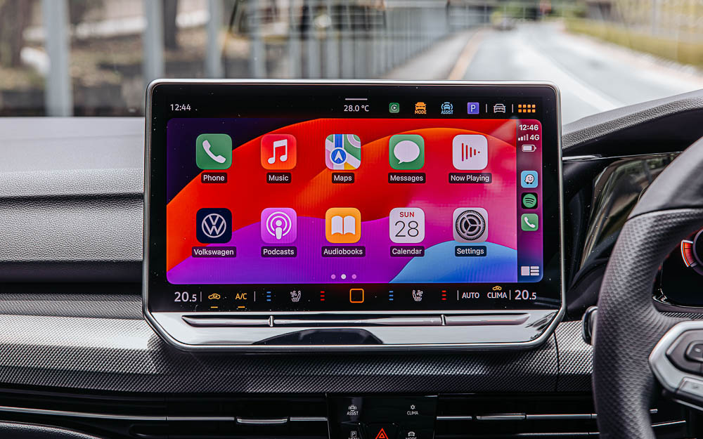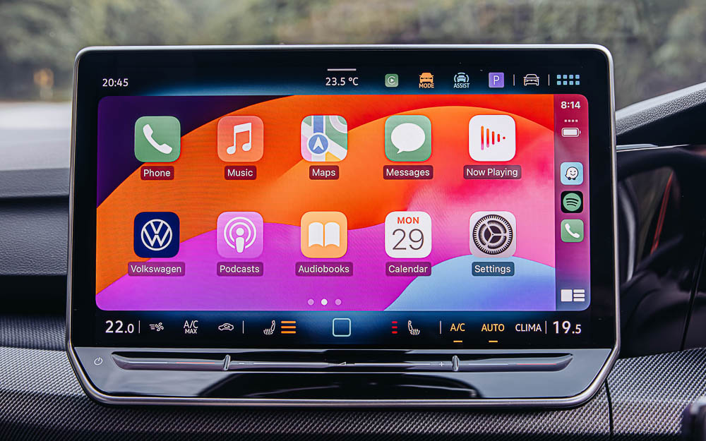 Enhanced comfort features include the 3-zone Air Care Climatronic climate control, wireless Apple CarPlay and Android Auto, voice-controlled IDA assistant, and wireless charging. The multifunction leather sports steering wheel — heated and tactile — underscores Volkswagen’s attention to driver ergonomics.