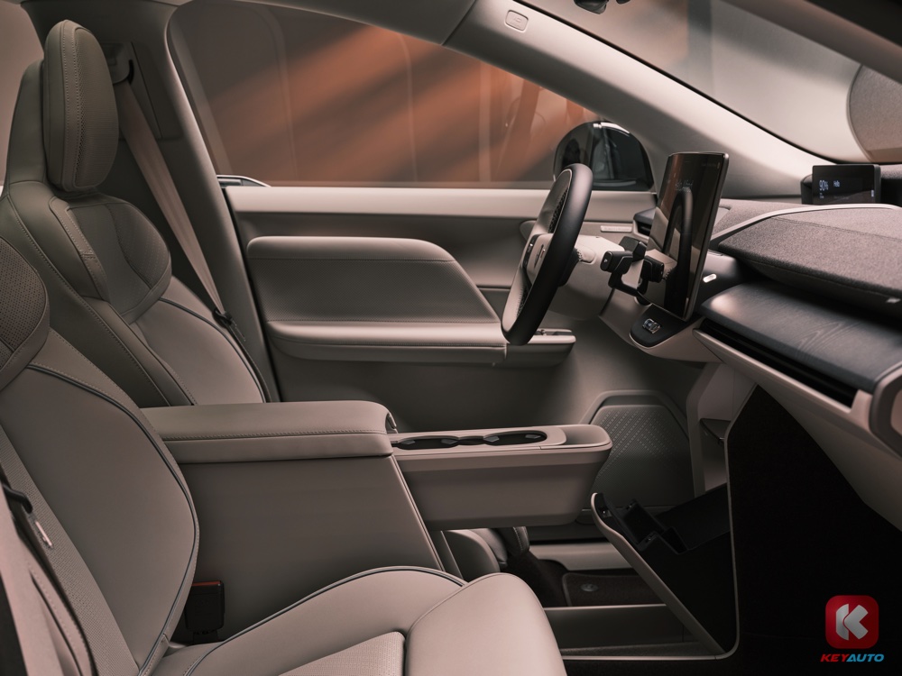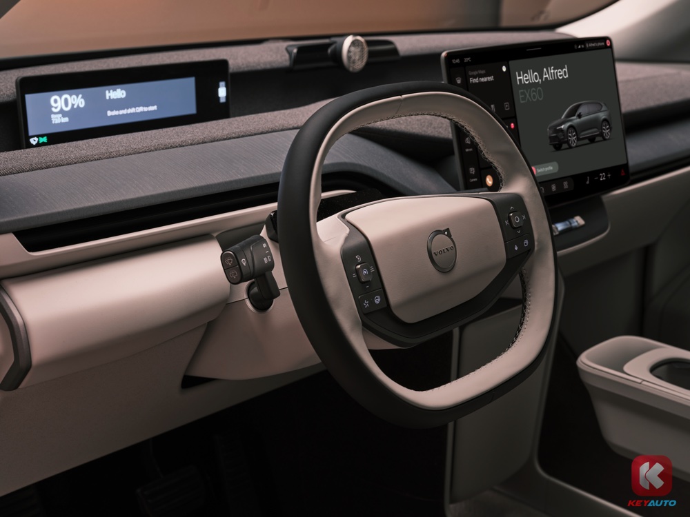 车内是 Volvo 一贯的北欧风格设计,双辐式方向盘、数码化仪表板和横向的中控荧幕,冷气出风口则隐藏在中控台上的设计线条里。仔细一看,Volvo EX60 取消了许多实体按键,排挡杆改为怀挡设计,而中控荧幕下方也只有两颗按键。
