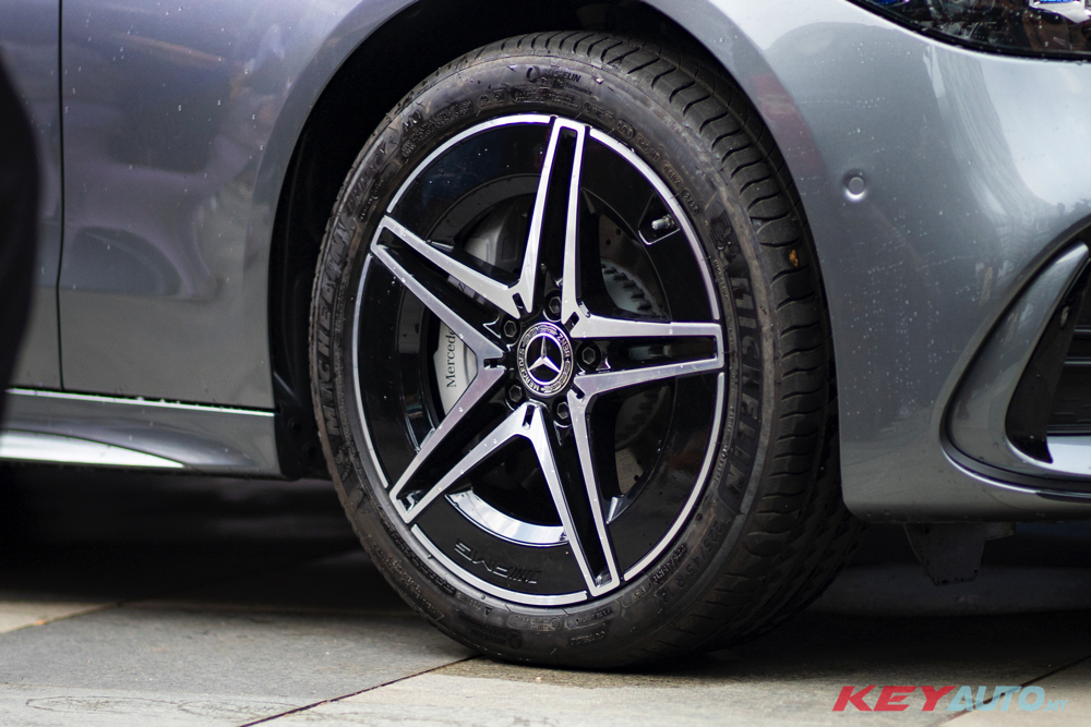 C350e 外观配备了 AMG Line + Night Package 运动化套件,采用 18 寸 AMG 轮圈(C300 是 19 寸)、Digital Light 头灯组和气压悬吊(后轴)。