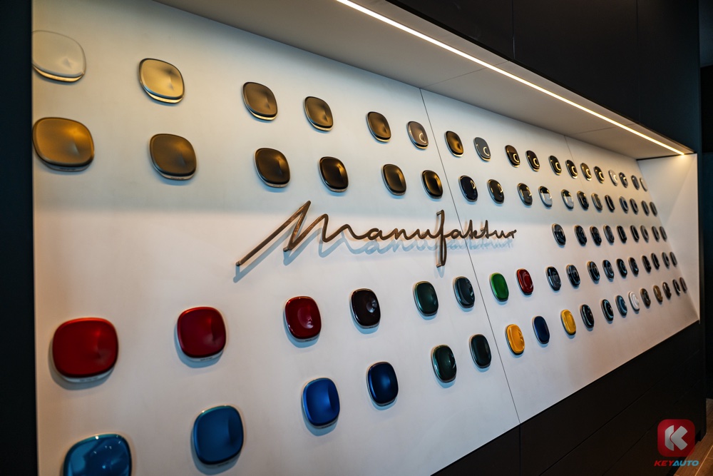 这里也设有 Manufaktur 定制区域,为客户提供选装配件,为爱车量身定制。数码大荧幕则播放高质量视频内容,生动地展现每个品牌故事。