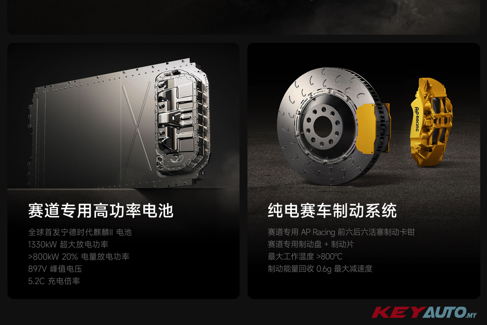 动力上,SU7 Ultra 原型车搭载的是双 V8s + V6s 三电机,配上全轮驱动配置,最大马力 1,548PS。加上赛道专用电池组,百里加速只需 1.97 秒,0-200km/h 只需 5.96 秒,极速超过 350km/h。为了更符合赛道版的用途,车子也采用了 AP Racing 赛道专用煞车系统,100-0km/h 煞车距离仅为 25m。