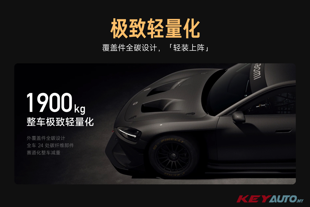 为了实现极致的轻量化,该车采用 “全碳” 设计,全车钣件都是 100% 使用碳纤维材料打造,使整车减重到 1,900kg。