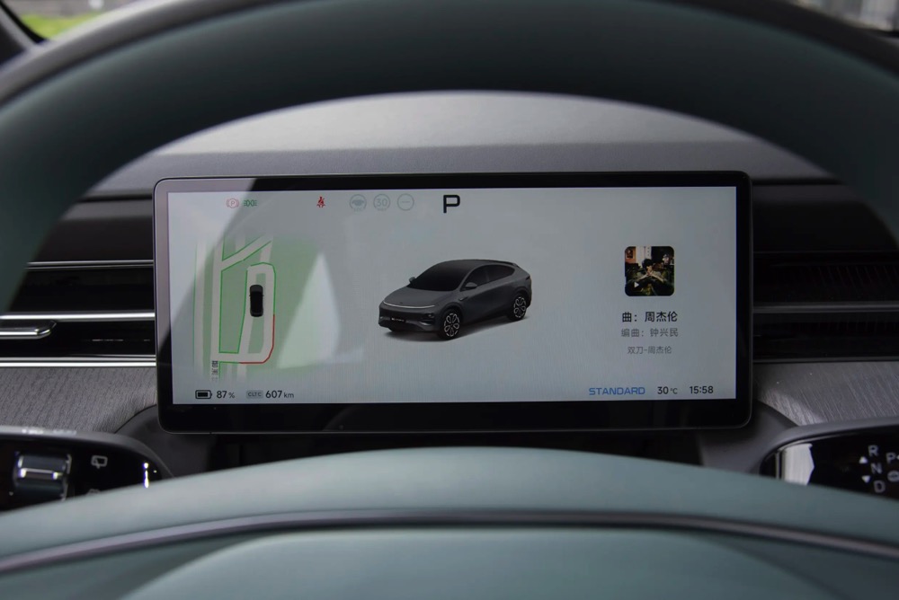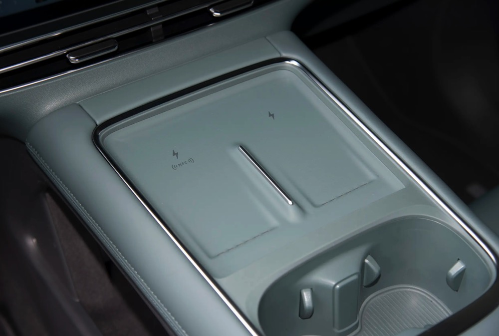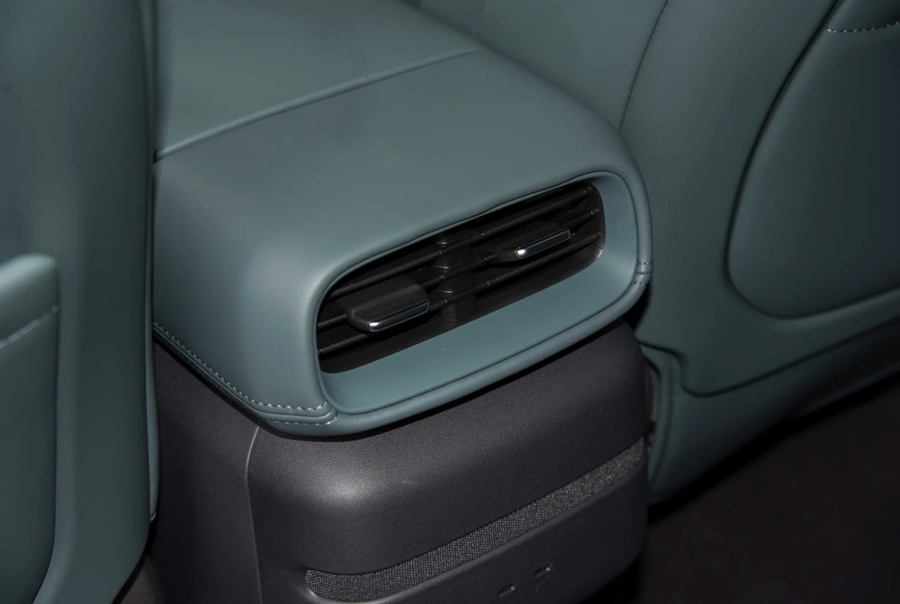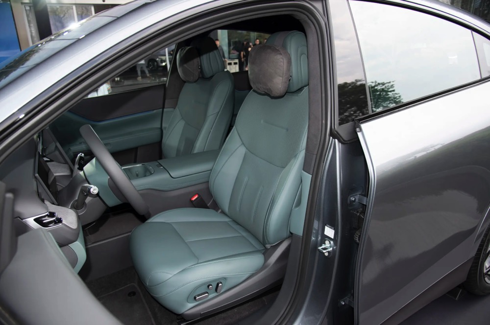 内装配备了 10.25 寸数码化仪表板、15.6 寸中控荧幕、前排座椅加热按摩共功能、后排座椅 12 向调节、手机无线充电面板、超纤绒顶棚和遮阳板等。