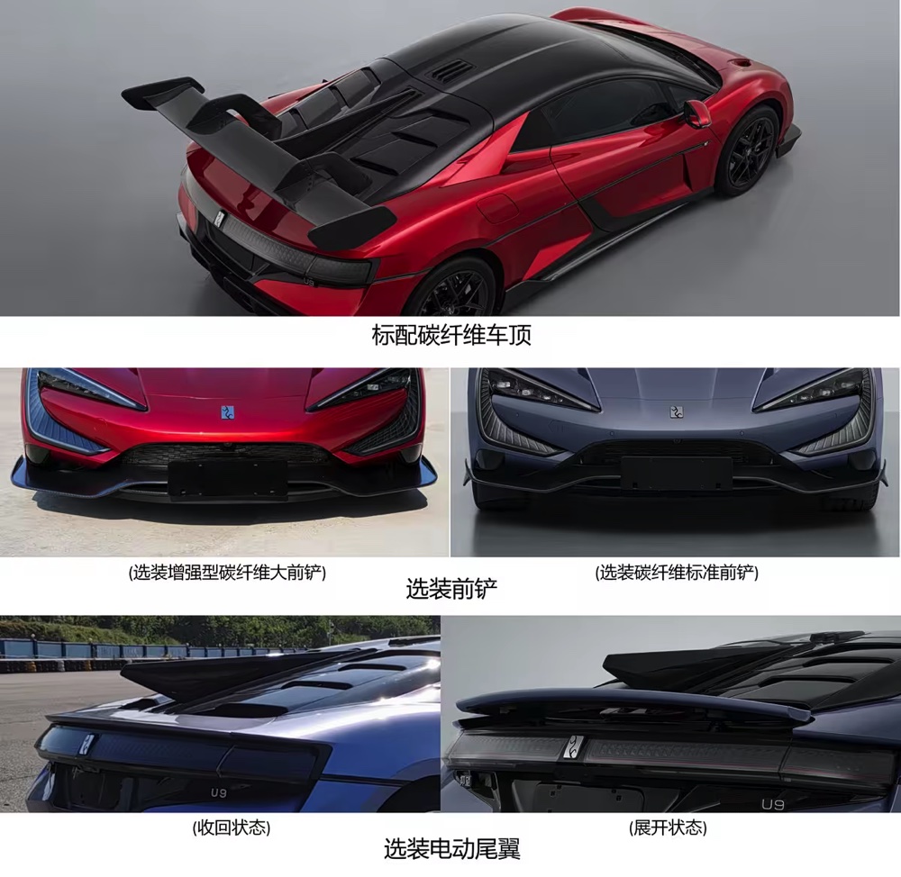 根据中国媒体报道,中国工信部最新一批的新车申报名单中就有仰望 U9 赛道版的申报信息。从图片上来看,车子沿用了标准版 U9 的设计,流畅的是车身线条,C 字形头灯,配有放射式线条设计的日行灯。车身设计低趴,同样配备碳纤维车顶、固定式碳纤维尾翼和扩散器,但轮胎尺寸则改为 325/35ZR20(112Y)。不过,资料显示赛道版 U9 将提供碳纤维套件、电动尾翼、碳纤维前铲等作为选配。