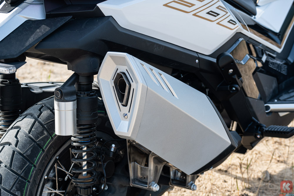 轮圈则是采用前 17 后 14 寸真空辐条轮圈,刹车则是前后 J.Juan 刹车卡钳,配有可自行选择关闭或开启ABS 系统,强调其越野属性!