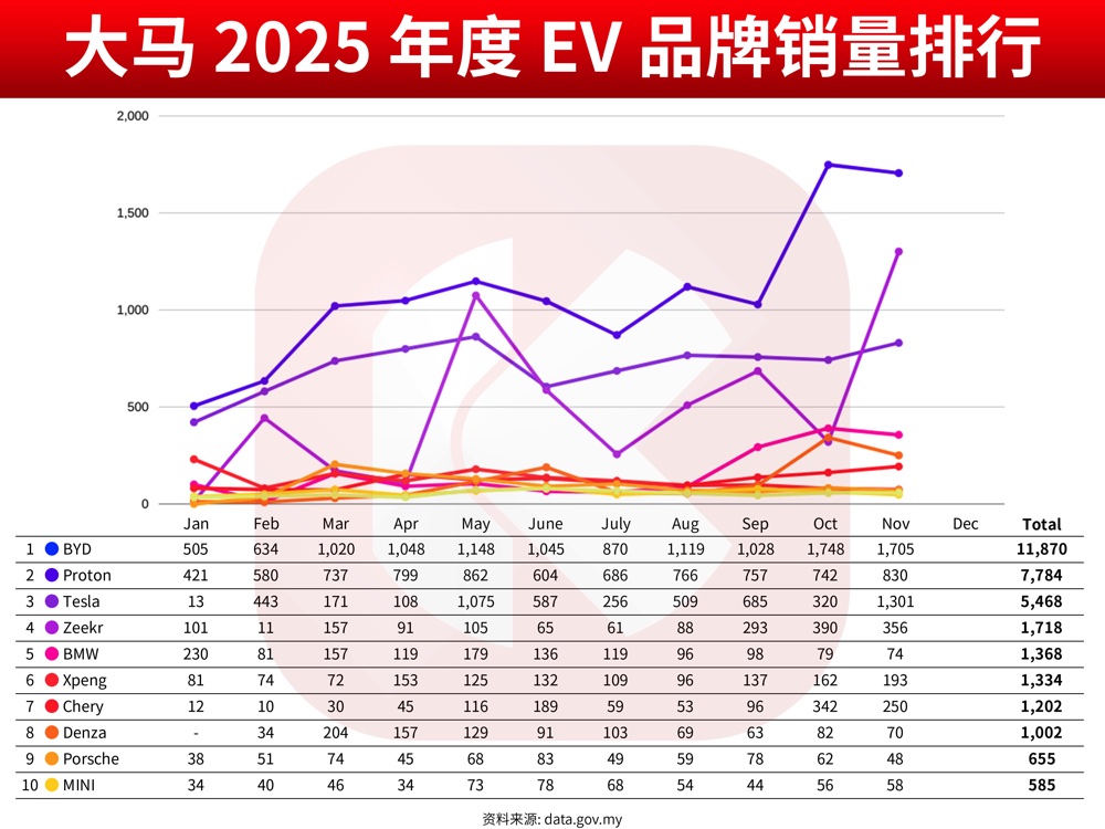 从 2025 年电动车品牌销量排行榜来看,年度畅销电动车品牌将会是 BYD,年初至今累计销量已有 11,870 辆。紧随其后的是靠着 Proton e.MAS 7 撑起半片天的 Proton,然后便是在 11 月份销量激增的 Tesla。