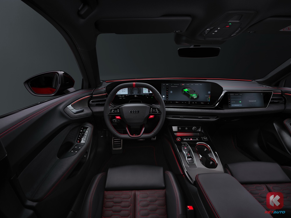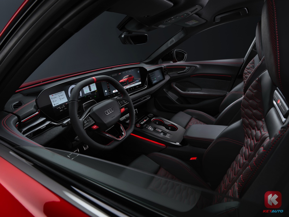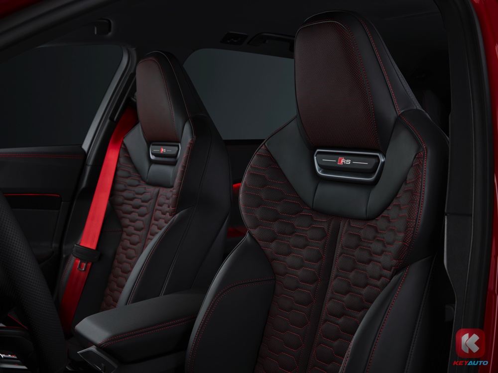 内装则延续以往的黑色设计,并配以 11.9 寸Audi 虚拟座舱和 14.5 寸 MMI 触控式荧幕组成的全景现实荧幕,副驾座则额外配有 10.9 寸的娱乐影音荧幕。前排的运动座椅采用蜂窝状绗缝设计,并标配电动调节和按摩功能。入门级 RS 5 不提供真皮座椅,而高配版则可选装红色/灰色真皮座椅。