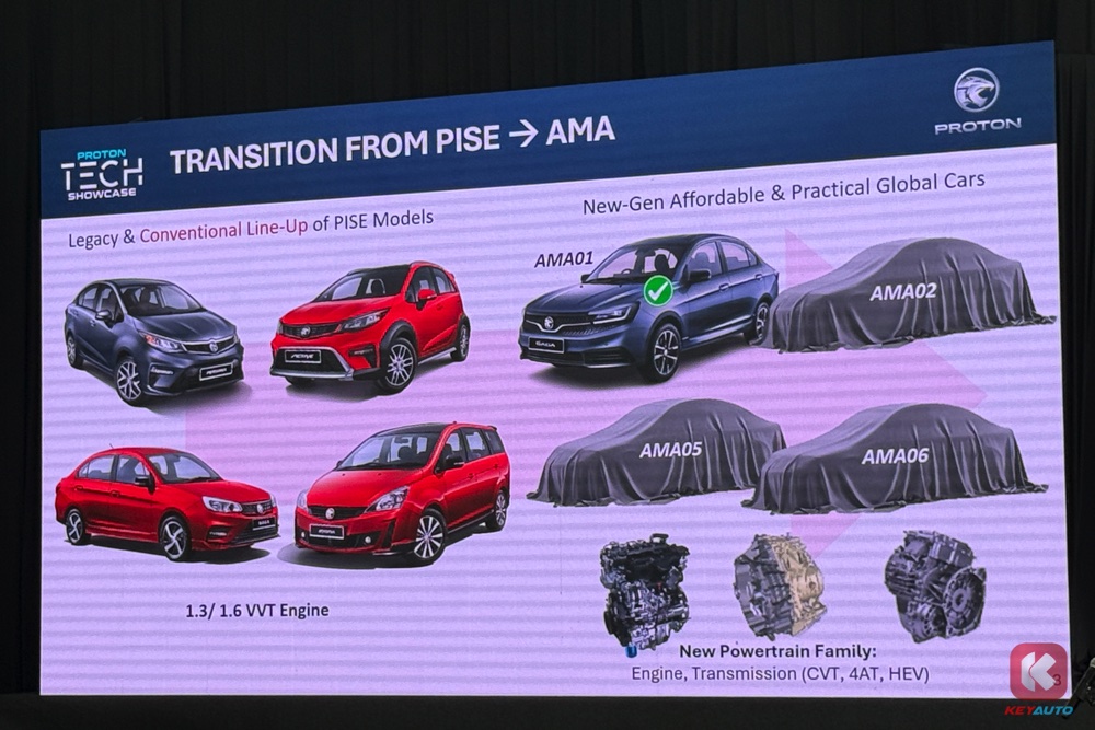 这里说的 AMA 平台其实就是全新 Saga 所采用的 Advanced Modular Architecture 平台。图中显示这三款车将搭载 CVT、4AT 以及 HEV 三种不同的变速箱,而这几款车将逐步取代现有的 PIES 车型,也就是 Persona、Iriz、Exora 和旧款 Saga。