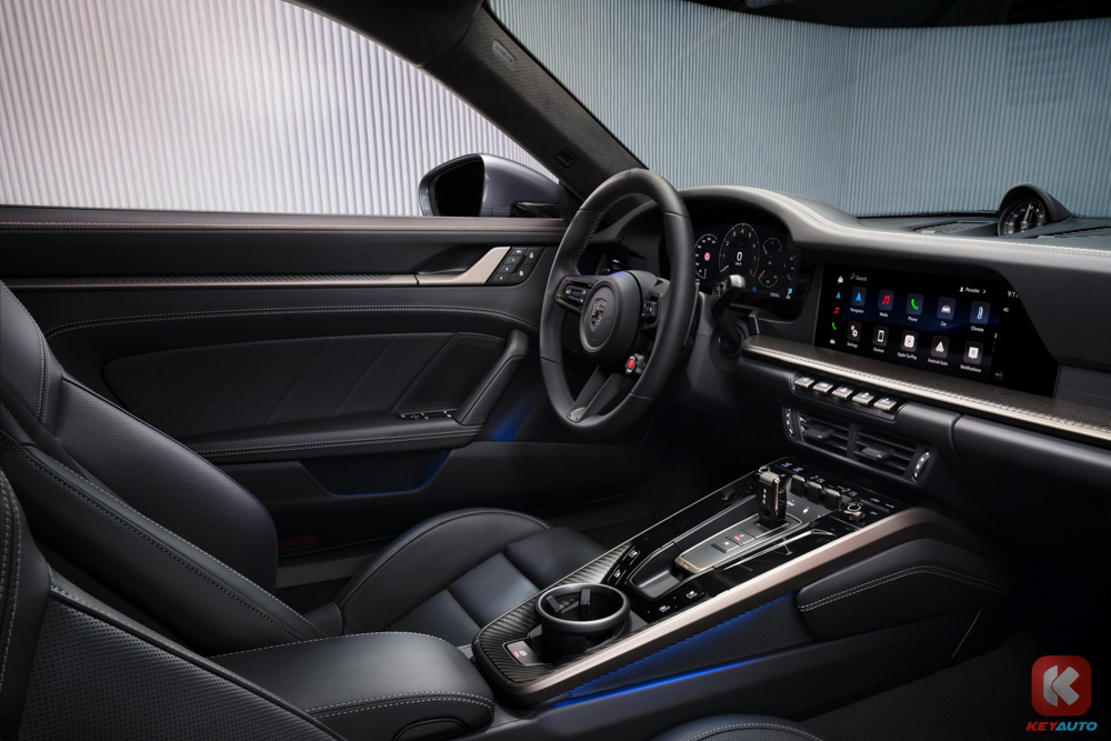 在外观和空气力学方面,新车配有主动进气、可伸缩前唇与多段式后扰流,可在高速与湿地环境下自动调整下压力与阻力,实现兼顾日常与赛道的表现。而整体外观也沿用了与 911 GTS 相似的前脸造型,标志性的两侧巨大开口依旧保留,排气管也经过设计成了造型较为正方的轻量化钛合金排气系统。