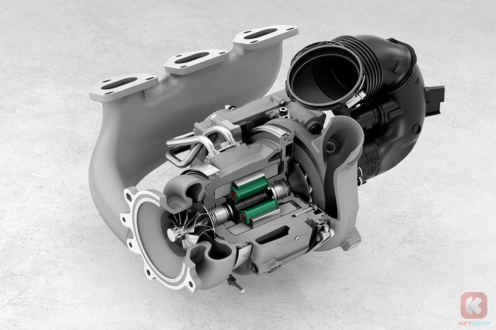 eTurbo 的作用是让电动马达可以在引擎低速或排气流量不足时主动带动涡轮叶片“先转起来”,几乎消除涡轮迟滞,并能在涡轮处回收能量再充回电池。这个设计可同时做到 “瞬间响应” 与 “持续高功率” 。简单来理解,整个动力系统的逻辑就是「引擎 + eTurbo + 变速箱侧电机」三者协作。