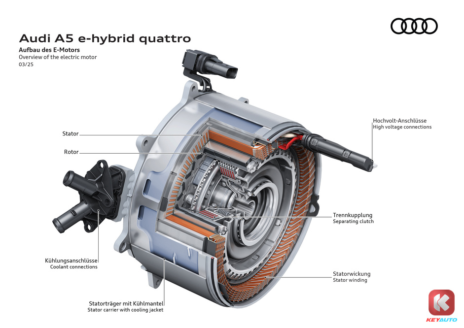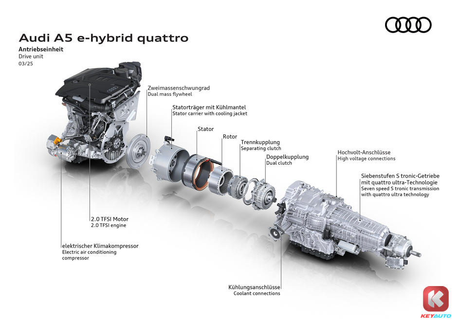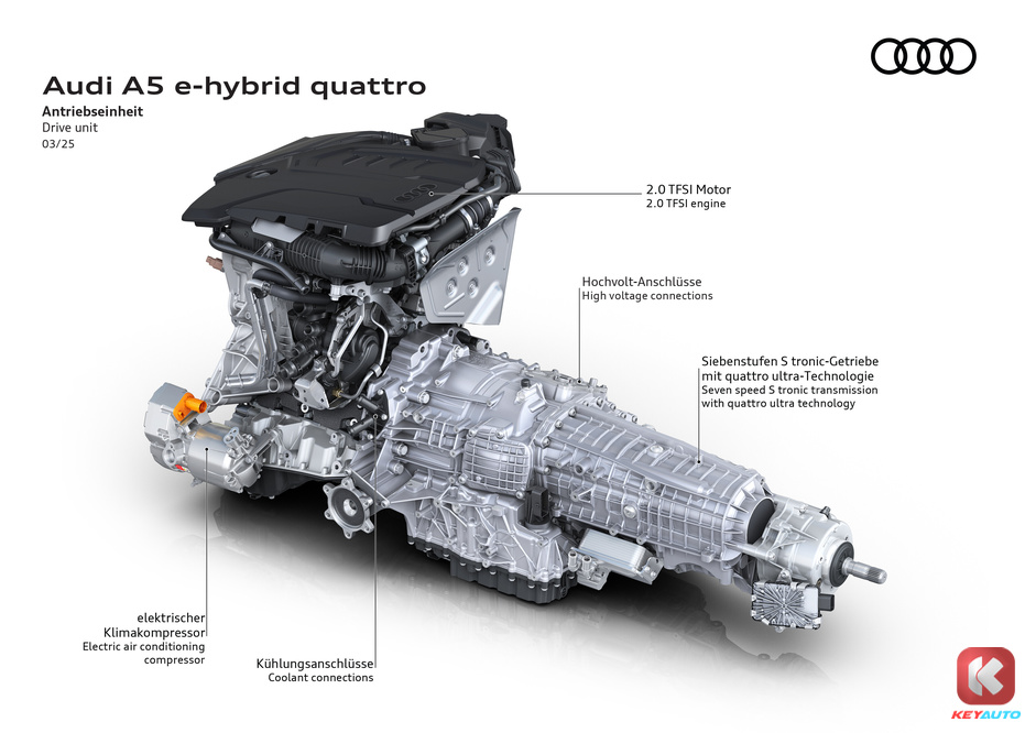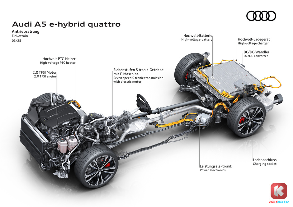 Audi A5 PHEV 以燃油版 A5 作为基础,采用PPC 平台打造,并且为旗下的 PHEV 车型被命名为 “e-hybrid”。