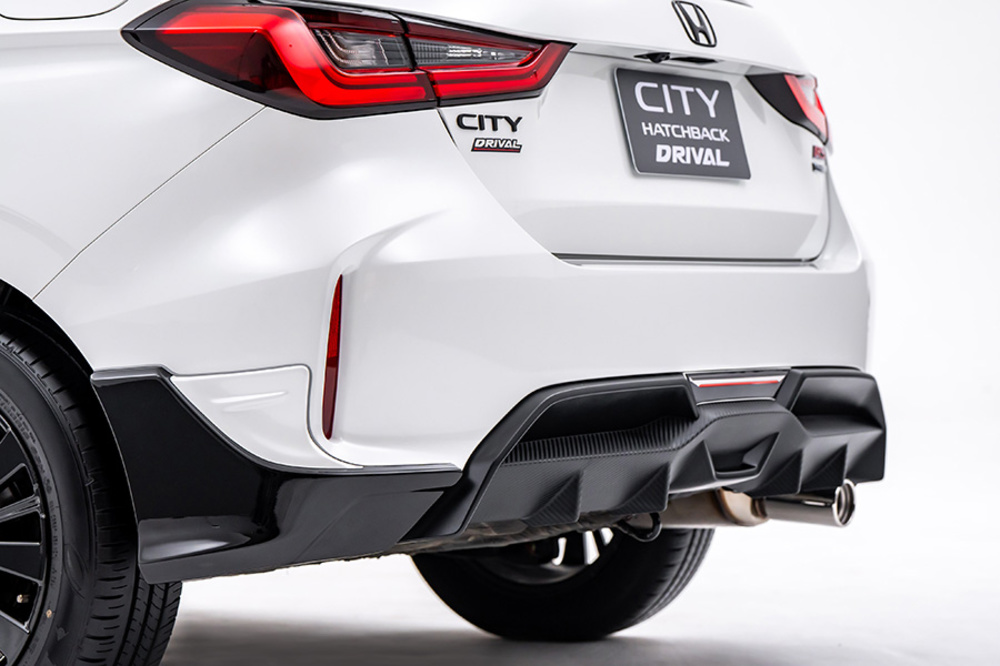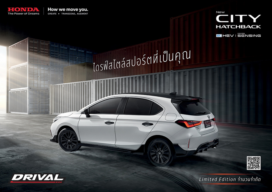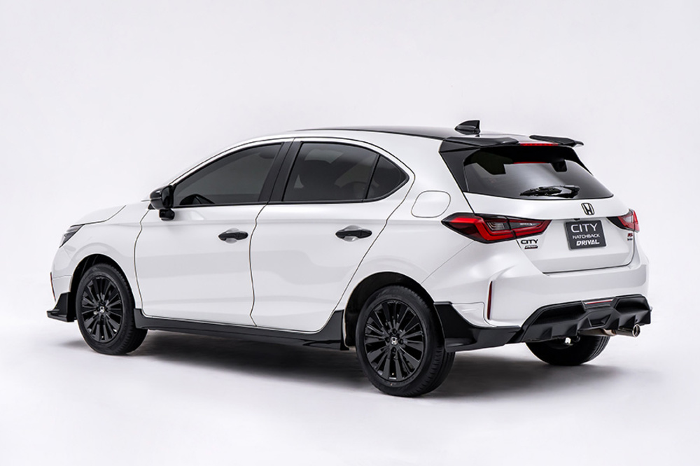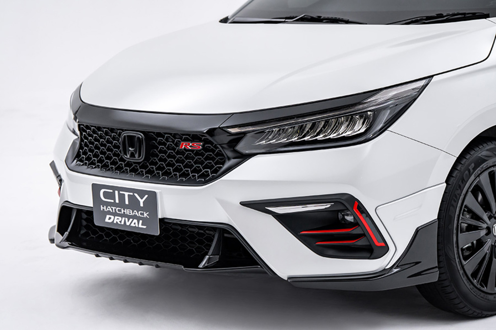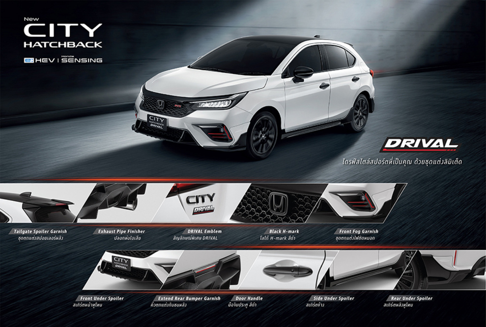 特仕版 City Hatchback DRIVAL 以顶配 e:HEV RS 车型为基础,以珍珠白色配上黑色空气力学套件,包括前扩散器、侧裙、后保险杆、雾灯框架和车顶扰流板。其他配备有黑色车顶、车侧后视镜盖、黑色门把、16 寸多辐式黑色轮圈以及车尾的 “DRIVAL” 标志。