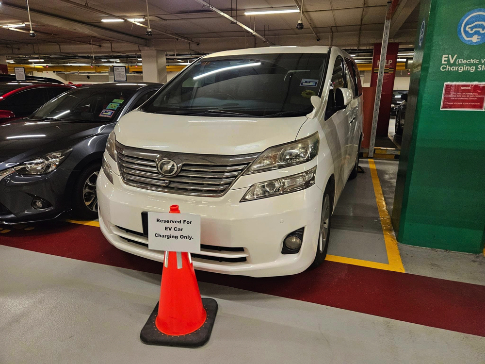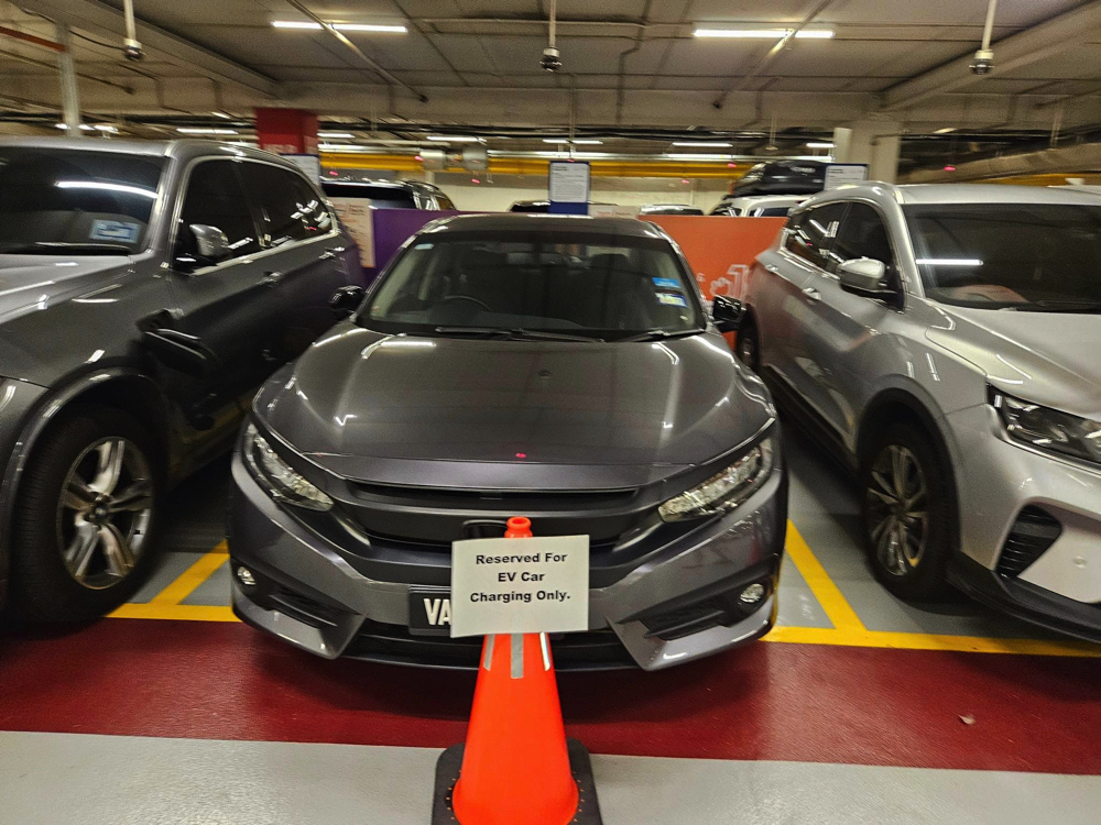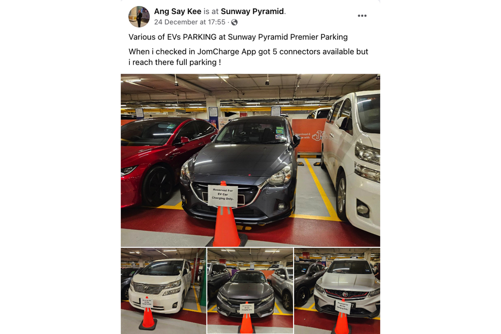 其中有一位 EV 电动车用户在 Facebook “EV 电动车交流站” 发文诉苦,虽然在 JomCharge 手机应用程序显示 Sunway Pyramid 停车场内有 5 个充电器可用,但是他抵达现场后发现,竟然全部都被燃油车霸占,包括 “Vellfire EV“、”Civic EV“、”X50 EV“ 和等等。
