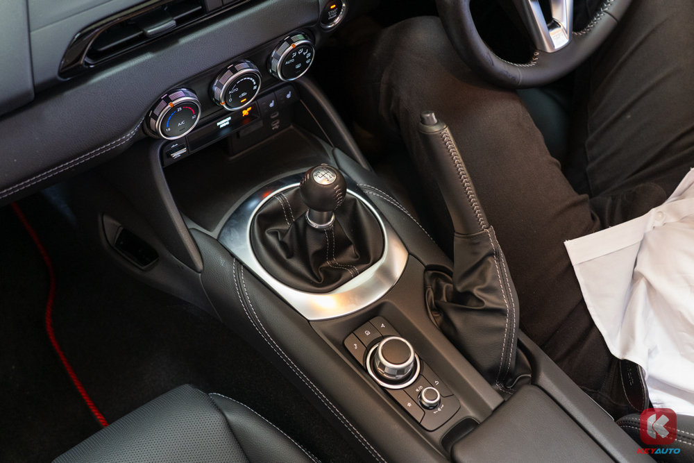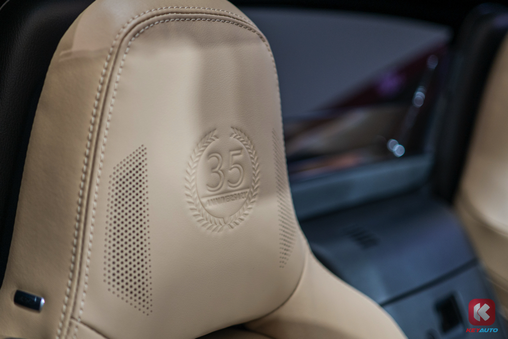 有别于一般的 MX-5 的黑色皮革内装,35 周年纪念版的 MX-5 采用了浅褐色皮革内装,座椅头枕和地毯上有 “35th Anniversary Edition” 标志压花,车门和冷气出风口上也具备与车色同样的饰板。