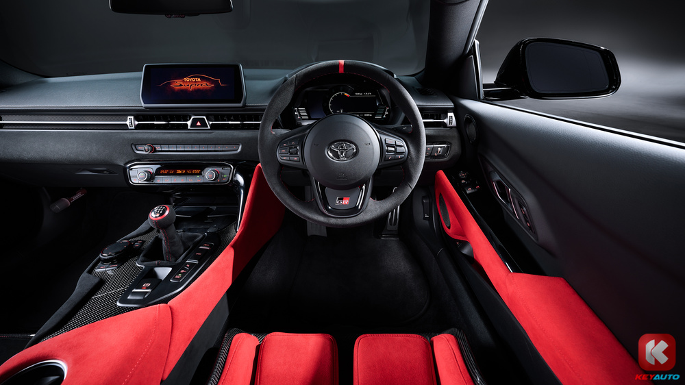 Supra A90 Final Edition 进行了一系列升级,包括引擎盖通风口、鸭尾、鹅颈设计的碳纤维后扰流板等,借以改进空气动力学。车子搭载 19 寸前轮和 20 寸黑色轮圈,配上红色煞车卡钳,一眼望去极狂野气息十足。